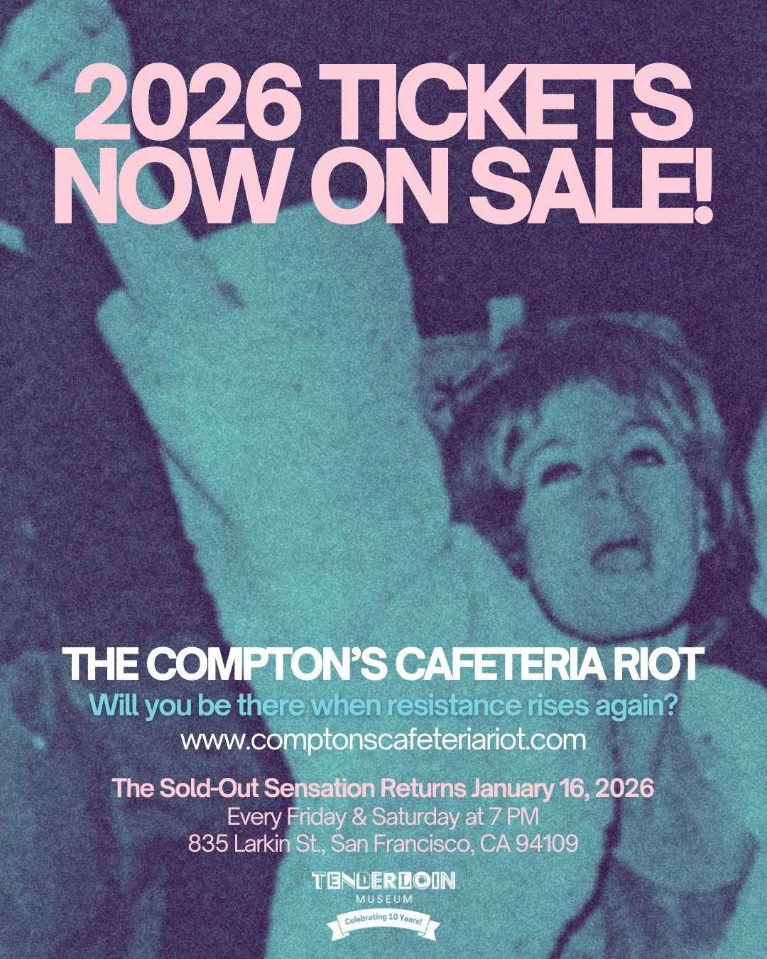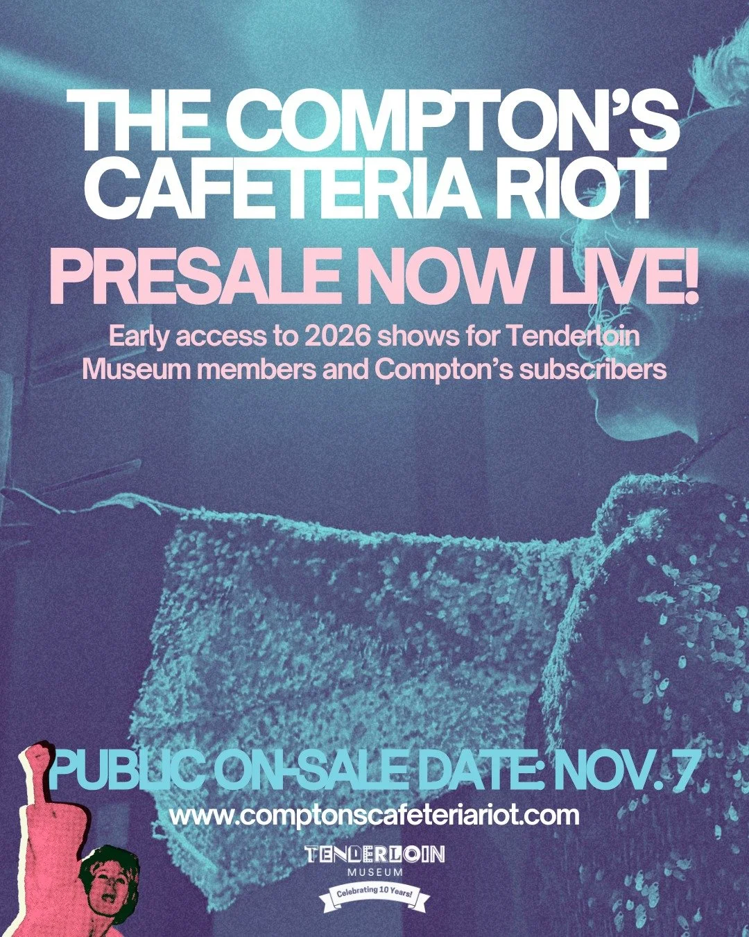 The fall season of The Compton’s Cafeteria Riot concludes on October 25, followed by two Sunday matinees on November 9 & 16, and a holiday drag spectacular on December 18. Regular Friday and Saturday shows resume on January 16, 2026. PURCHASE TICKETS.