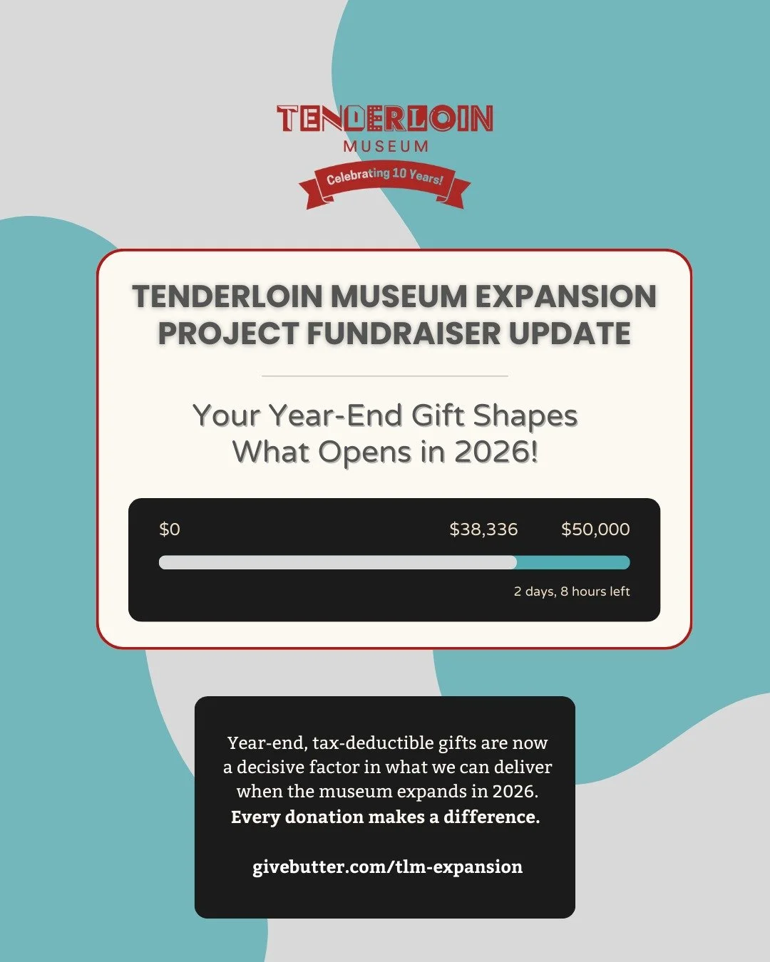 Tenderloin Museum is on the brink of something extraordinary. In 2026, we’ll open a new 6,850-square-foot space that triples our size and lets us tell more Tenderloin stories than ever—but only if we complete this final phase of fundraising. Our goal is to raise $50,000 by December 31. Your donation isn’t abstract: it becomes the exhibit walls where histories are shared, the workshops where young people make art, the archives that preserve community memory, and the gathering spaces where neighbors feel seen and celebrated. This is a once-in-a-generation moment to expand the museum’s impact, and it won’t happen without you!