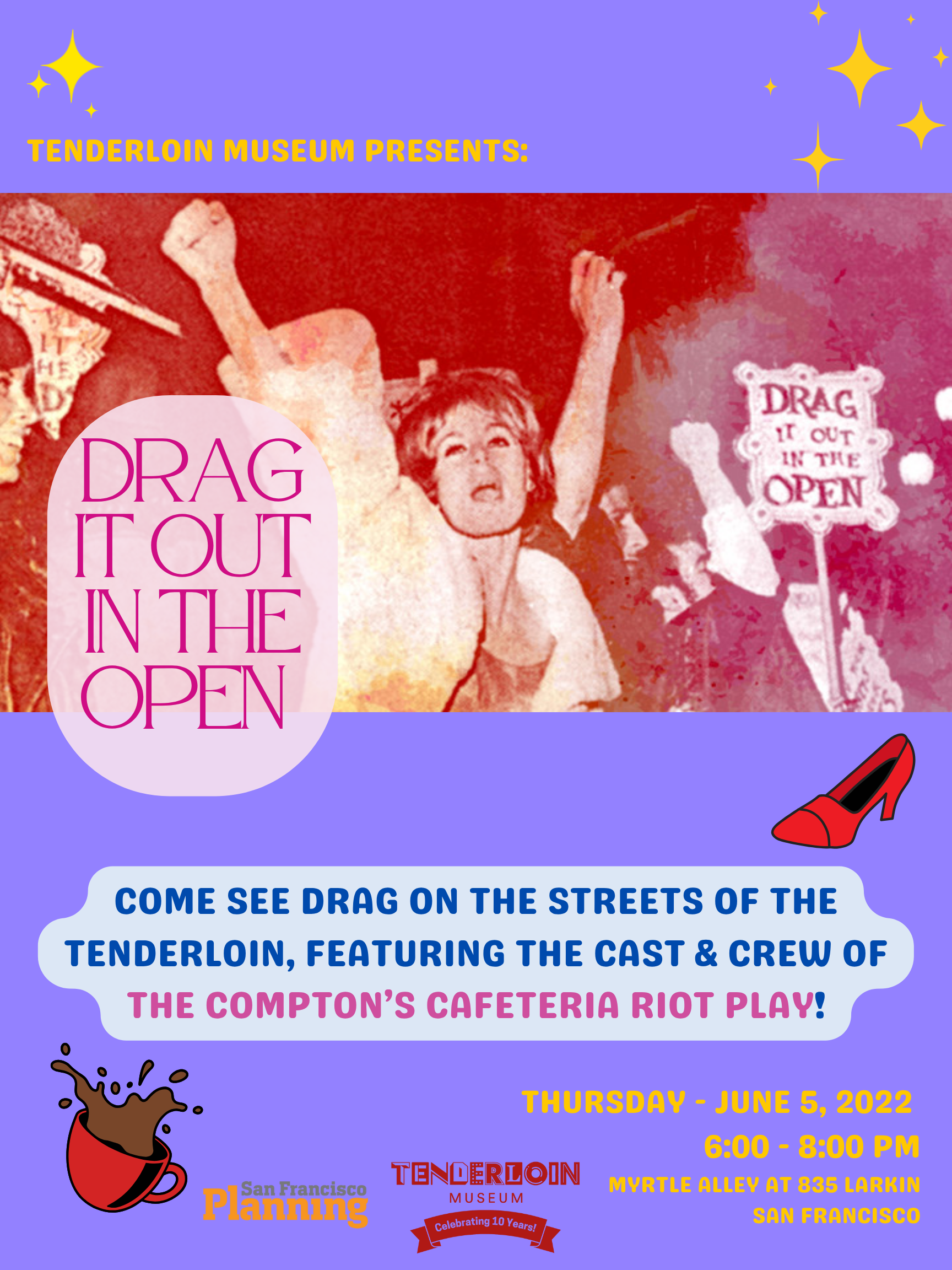 From April-September, Tenderloin Museum teams up with SF Planning to produce a series of block parties in Myrtle Alley during the SF First Thursday Art Walks in the Tenderloin & Lower Polk. June is Pride month, so TLM has tapped the cast and crew of its ongoing immersive theater piece, The Compton’s Cafeteria Riot, to bring the spirit of queer joy and trans resistance out of doors and into the streets!
